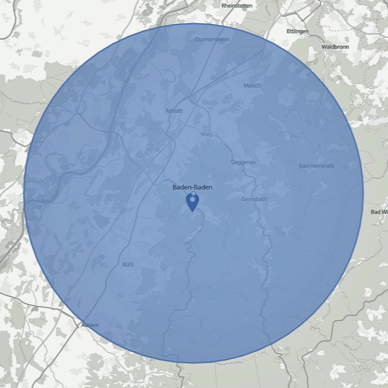 Die Impressumsanschrift richtet sich an alle Zielgruppen im Umkreis von maximal zwanzig Kilometern rund um Baden-Baden, einschließlich der angrenzenden französischen Gebiete.